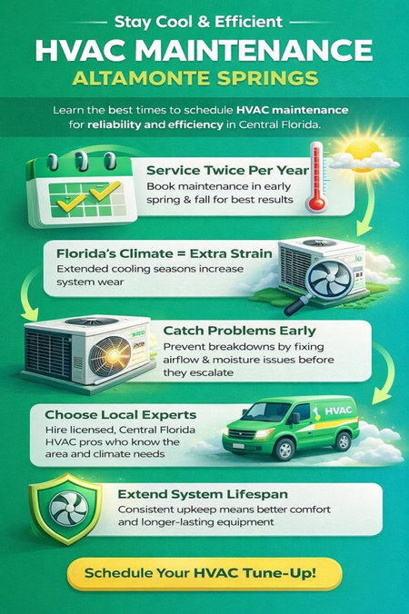 HVAC maintenance in Altamonte Springs focuses on preventative service for systems that run year-round, especially heat pumps. Because Central Florida homes experience frequent mode switching and high humidity, regular maintenance helps reduce energy waste, prevent unexpected breakdowns, and extend system lifespan. For most homes, professional HVAC maintenance once or twice per year is the most effective way to maintain comfort and control long-term costs.
